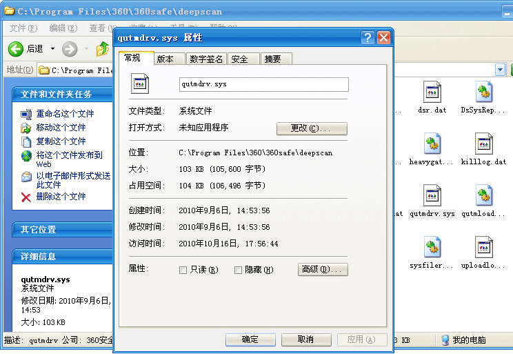 360 深度扫描程序中的文件“qutmdrv.sys”,其具体安装位置为360安全卫士安装目录下的“\360\360safe\deepscan \qutmdrv.sys”,其对应的版本为“6.5.5.1010”。“qutmdrv.sys”究竟为何东东,官方也没能给出个所以然,查看文件属性只能得知其具有“数字签名”。不知道这是小红伞误报还是360为非作歹?
