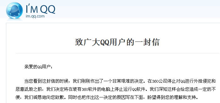 当您看到这封信的时候,我们刚刚作出了一个非常艰难的决定。在360公司停止对QQ进行外挂侵犯和恶意诋毁之前,我们决定将在装有360软件的电脑上停止 运行QQ软件。我们深知这样会给您造成一定的不便,我们诚恳地向您致歉。同时也把作出这一决定的原因写在下面,盼望得到您的理解和支持。...详情:http://im.qq.com/qq.shtml