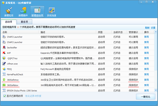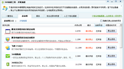 360安全卫士7.6最新版中的“开机加速”列表:对于QQ电脑管家,“建议禁止”处理。