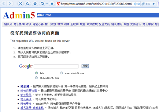 “客户要求删除”(客户即“华夏名网”),原始文章被Admin5删除,访问页面提示:“没有找到您要访问的页面”404错误