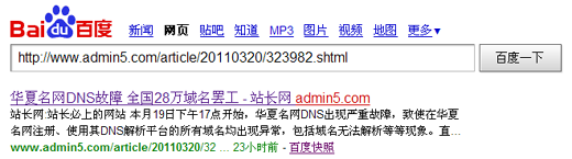 前些日子,笔者据现实遭遇如实撰写了一篇关于“华夏名网DNS故障,全国28万域名罢工”的文章(原文在Admin5的链接:http://www.admin5.com/article/20110320/323982.shtml)。文章描述的是华夏名网DNS故障剖析,以及笔者及其客户受到的损害,并由此引发的深思。文章同步在CHINAZ和Admin5等国内知名站长网站发表,同时被各大网站转载。因为过多细节性地描写了华夏名网服务不作为、质量不保障等等现状,在文章发表的第二天,Admin5网站在华夏名网的淫威下,被迫删除了这篇文章。与此同时,华夏名网并未就其DNS故障及其不良影响做出任何声明和歉意。