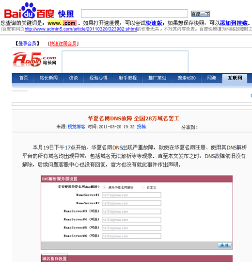 华夏名网DNS故障,全国28万域名罢工 (2011-3-20 18:0:32)