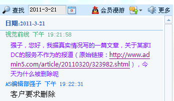 与A5编辑部强子的QQ聊天记录中得知:文章因为“客户要求删除”(客户即“华夏名网”)