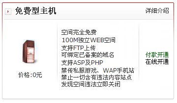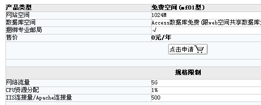 基本信息:基础型500M免费空间(500M空间+500 IIS,支持:ASP)、增强型300M免费空间(300M空间+300M MySQL+300 IIS,支持:ASP/PHP)、VIP1000M免费空间(1000M空间+1000M MySQL+1000 IIS+独立程序池,支持:ASP/PHP)。