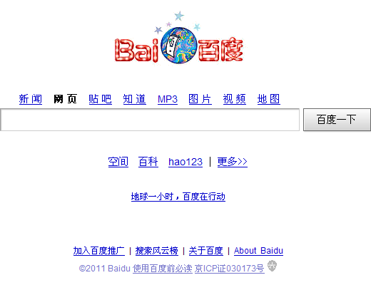 “地球一小时,百度在行动”。百度很少在首页做出这种“影响用户体验”的广告推广方式。我们常见的是,百度和湖南卫视的合作广告倒是经常出现在此。记得某次百度在此处给联想做了个类似的广告宣传链接,而打开链接后,在对应的百度空间里,全是对百度浓重商业化操作的指责和谩骂。