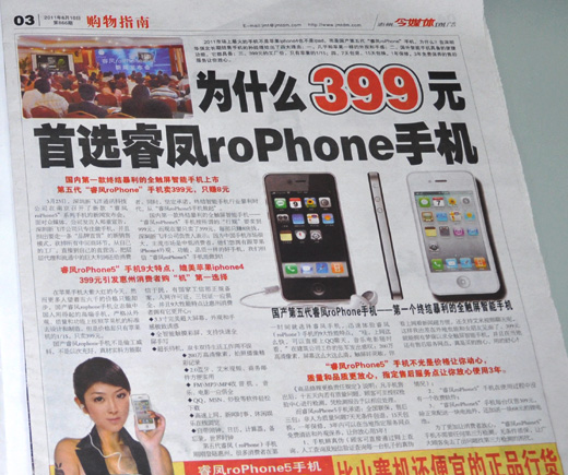 笔者前段时间在广东某知名媒体2011年6月10日第866期03版“购物指南”版块见到一则整版广告,介绍的是某山寨国产手机,广告内容如下:
