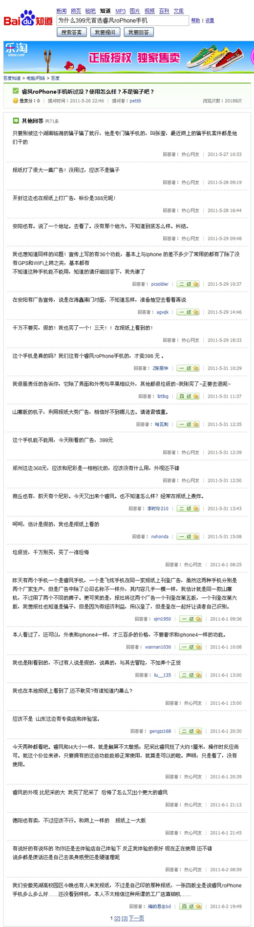 购物有风险,消费者还需谨慎!从网友的回帖我们可以得知,该手机厂商大多通过大篇幅的报纸广告来收买不明真相的收费者。