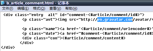我们打开b_article_comment.html文件,找到代码中的“www.gravatar.com”,将其改为“en.gravatar.com”,或:“0.gravatar.com”、“1.gravatar.com”、“2.gravatar.com”、“3.gravatar.com”、“cn.gravatar.com”。