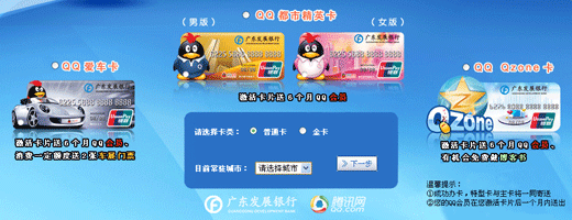 广东发展银行在南方的名气很大,此次为推广信用卡,联合腾讯推出“广发QQ信用卡系列(异型卡命名:爱车卡、都市精英卡、Qzone卡)”活动,成功激活QQ卡免费送6个月QQ会员,价值60元。