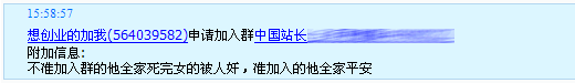顺便说一下,能申请加入该群的,一定是站长,且不说谁谁谁。这等站长素质低下,忠于愤青,擅长恶语中伤,我看还是不要的好,多一个不多少一个不少,免得一粒老鼠屎糟蹋一锅粥了。如今,很多网友加入站长这个行业,行业门槛也越来越低,职业素养(包括专业技术含量)却成反比,行业变得良莠不齐,恶性循环。正所谓林子大了,什么鸟都有。很多质量不过关的小站长也在滥竽充数,严重影响了互联网的良性发展。俗话说:长得丑不是你的错,错在不该出来吓人。做站长不是你的错,错就错在你素质低下、血口喷人。严重的看,作为中国人,你有辱国人形象。类似的事情遇到过很多,包括很多站长的低俗评论(容不下某人的观点,就破口大骂,等等)。这些可能都是出于一些容易冲动、年龄较低的暂长(站长)吧。虽然你是无意的,也可能是好玩的,但这些话真的很伤人,很不友好,你知道吗?恳请三思,无论做什么,都要三思而后行。