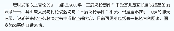 根据唐琳在QQ群的聊天记录,记者并未找全劳教决定书中所指全部内容,目前可见的包括有一把匕首的图案,图案为QQ系统自带表情。