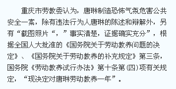 重庆市劳教委认为,唐琳制造恐怖气氛危害公共安全一案,除有违法行为人唐琳的陈述和辩解外,另有“截图照片“,”事实清楚,证据确实充分”,根据全国人大批准的《国务院关于劳动教养问题的决定》、《国务院关于劳动教养的补充规定》第三条,国务院《劳动教养试行办法》第十条第(四)项有关规定,“现决定对唐琳劳动教养一年”。